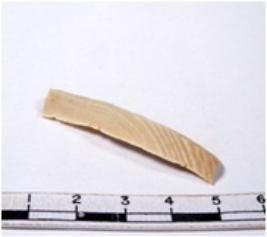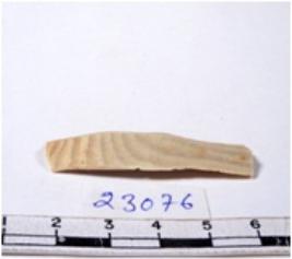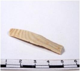 | Description / विवरण | A fragment of a rectangular shaped chert blade showing dorsal sides with sharp cutting edges having smooth surface and triangular section. |