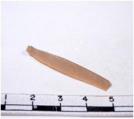 | Description / विवरण | A fragment of a rectangular shaped chert blade showing dorsal sides with sharp edges having smooth surface and triangular section. |