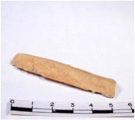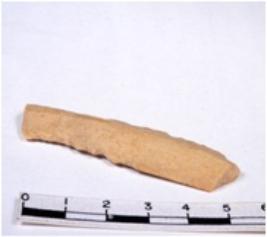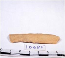 | Description / विवरण | A fragment of a rectangular shaped chert blade showing dorsal sides with sharp cutting edges having smooth surface and triangular section. |