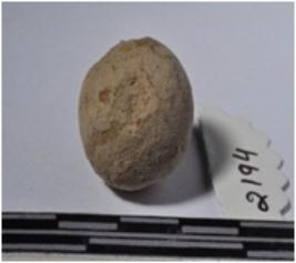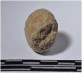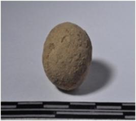| Description / विवरण | A terracotta sling ball, round in shaped and rough surface. |