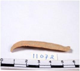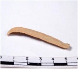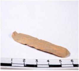 | Description / विवरण | A fragment of a rectangular shaped chert blade showing dorsal sides with sharp cutting edges having smooth surface and triangular section. |