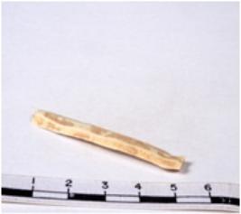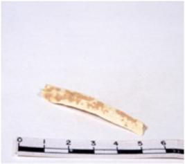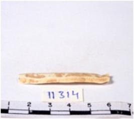 | Description / विवरण | A fragment of a rectangular shaped chert blade showing flat sides with sharp edges having smooth surface and triangular section. |