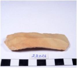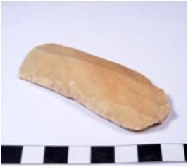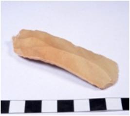 | Description / विवरण | A fragment of a rectangular shaped chert blade showing dorsal chert blade showing dorsal sides with sharp edges having smooth surface and triangular section. |