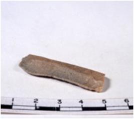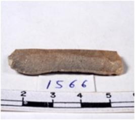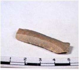 | Description / विवरण | A fragment of a rectangular shaped chert blade showing dorsal sides with sharp cutting edges having smooth surface and triangular section. |