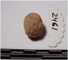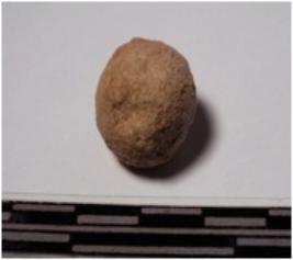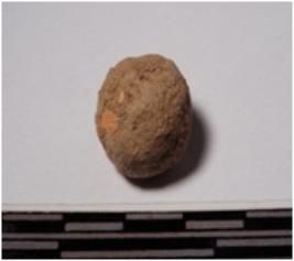| Description / विवरण | A terracotta uneven shaped sling ball of rough surface. |