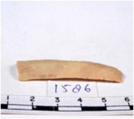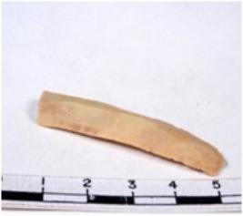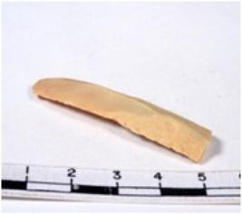 | Description / विवरण | A fragment of a rectangular shaped chert blade showing dorsal sides with sharp cutting edges having smooth surface and triangular section. |