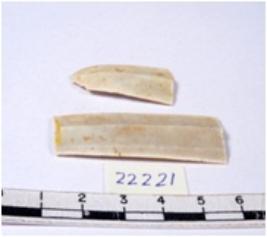 | Description / विवरण | A fragment of a rectangular shaped chert blade showing dorsal sides with sharp edges having smooth surface and triangular section. |