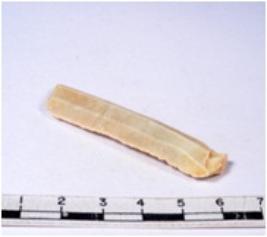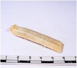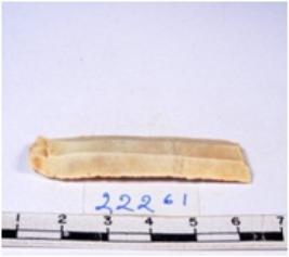 | Description / विवरण | A fragment of a rectangular shaped chert blade showing dorsal sides with sharp edges having smooth surface and triangular section. |