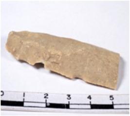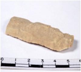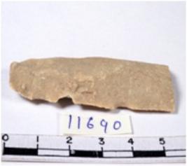 | Description / विवरण | A fragment of a rectangular shaped chert blade showing dorsal sides with sharp cutting edges having smooth surface and triangular section. |
