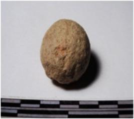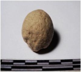 | Description / विवरण | A terracotta uneven round in shape sling ball of rough surface. |