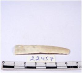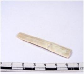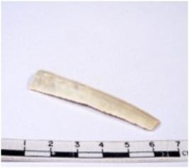 | Description / विवरण | A fragment of a rectangular shaped chert blade showing dorsal sides with sharp cutting edges having smooth surface and triangular section. |