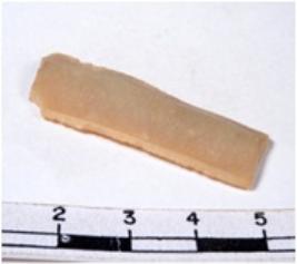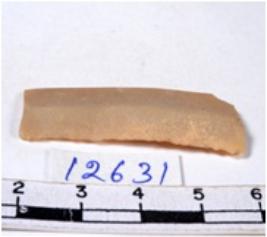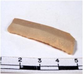 | Description / विवरण | A fragment of a rectangular shaped chert blade showing dorsal sides with sharp cutting edges having smooth surface and triangular section. |