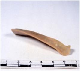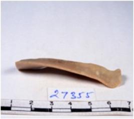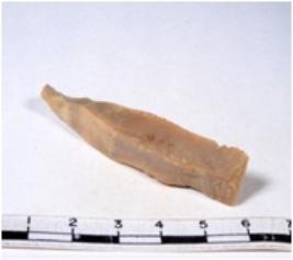 | Description / विवरण | A fragment of a rectangular shaped chert blade showing dorsal sides with sharp cutting edges having smooth surface and triangular section. |