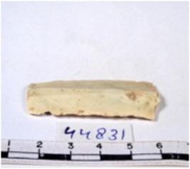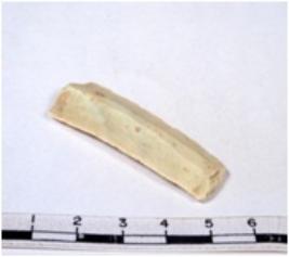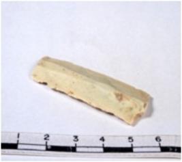 | Description / विवरण | A fragment of a rectangular shaped chert blade showing dorsal sides with sharp cutting edges having smooth surface and triangular section. |