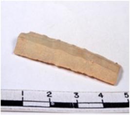 | Description / विवरण | A fragment of a rectangular shaped chert blade showing dorsal sides with sharp edges having smooth surface and triangular section. |