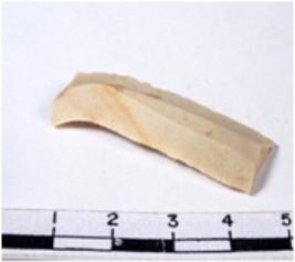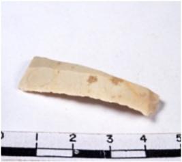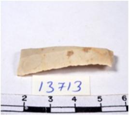 | Description / विवरण | A fragment of a rectangular shaped chert blade showing dorsal sides with sharp cutting edges having smooth surface and triangular section. |