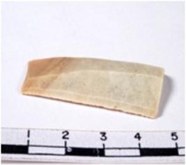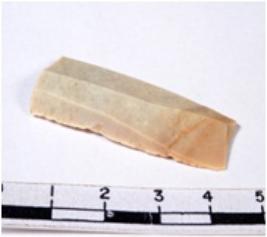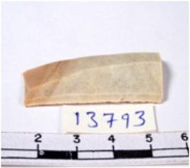 | Description / विवरण | A fragment of a rectangular shaped chert blade showing dorsal sides with sharp cutting edges having smooth surface and triangular section. |
