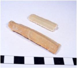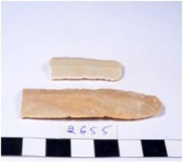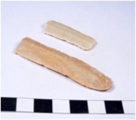 | Description / विवरण | A fragment of a rectangular shaped chert blade showing dorsal sides with sharp cutting edges having smooth surface and triangular section. |