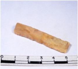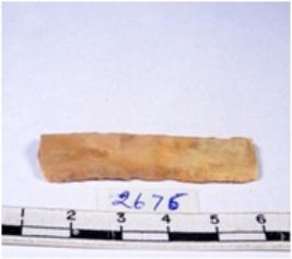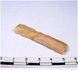 | Description / विवरण | A fragment of a rectangular shaped chert blade showing dorsal sides with sharp cutting edges having smooth surface and triangular section. |
