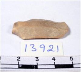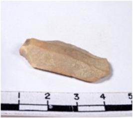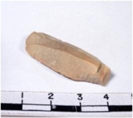 | Description / विवरण | A fragment of a oval shaped chert blade showing dorsal sides with sharp cutting edges having smooth surface and uneven section. |