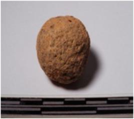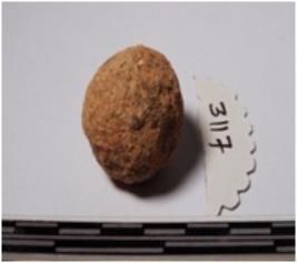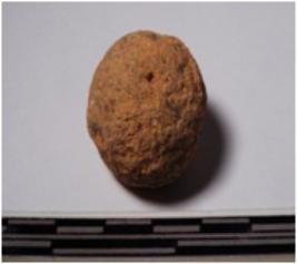 | Description / विवरण | A terracotta sling ball round in shape of rough surface. |