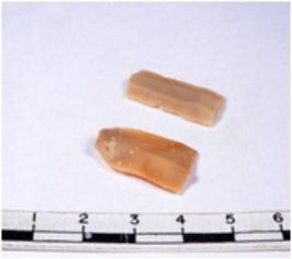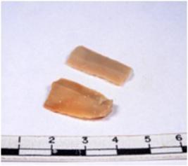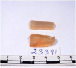 | Description / विवरण | A fragment of a rectangular shaped chert blade showing dorsal sides with sharp cutting edges having smooth surface and triangular section. |