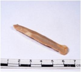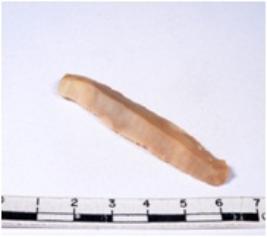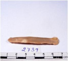 | Description / विवरण | A fragment of a rectangular shaped chert blade showing dorsal sides with sharp cutting edges having smooth surface and triangular section. |