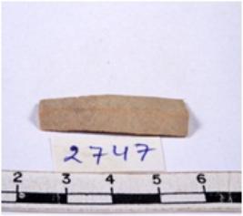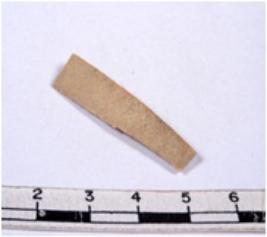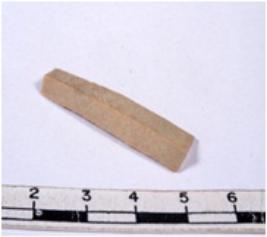 | Description / विवरण | A fragment of a rectangular shaped chert blade showing dorsal sides with sharp cutting edges having smooth surface and triangular section. |