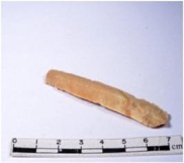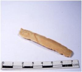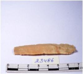 | Description / विवरण | A fragment of a rectangular shaped chert blade showing dorsal sides with sharp edges having smooth surface and triangular section. |