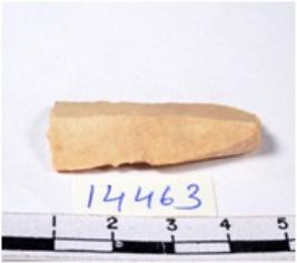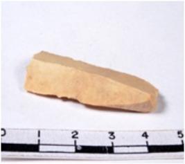 | Description / विवरण | A fragment of a rectangular shaped chert blade showing dorsal sides with sharp cutting edges having smooth surface and triangular section. |
