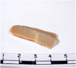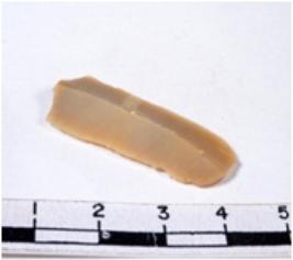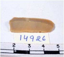 | Description / विवरण | A fragment of a rectangular shaped chert blade showing dorsal sides with sharp cutting edges having smooth surface and triangular section. |