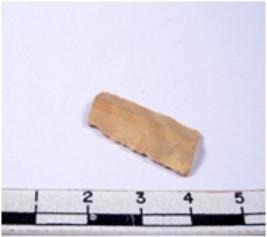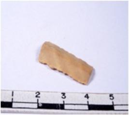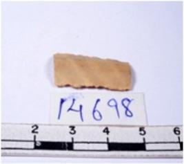 | Description / विवरण | A fragment of a rectangular shaped chert blade showing dorsal sides with sharp cutting edges having smooth surface and triangular section. |