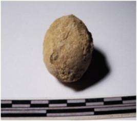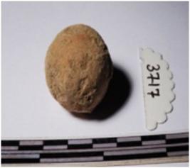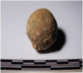 | Description / विवरण | A fragment of a terracotta round shaped sling ball, circular in section of rough surface. |