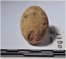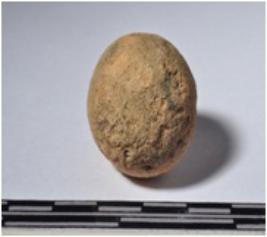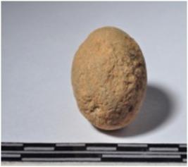 | Description / विवरण | A terracotta sling ball, round in shaped and rough surface. |
