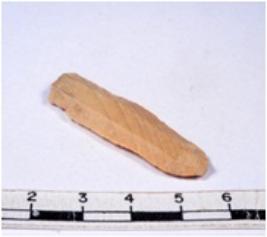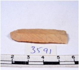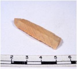 | Description / विवरण | A fragment of a rectangular shaped chert blade showing dorsal sides with sharp cutting edges having smooth surface and triangular section. |