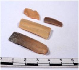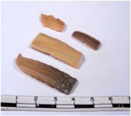 | Description / विवरण | A fragment of a rectangular shaped chert blade showing dorsal sides with sharp cutting edges having smooth surface and triangular section. |