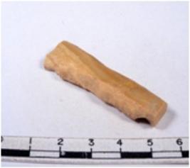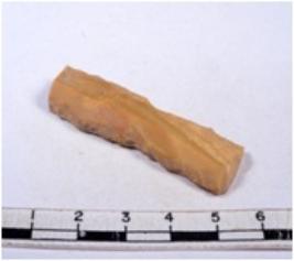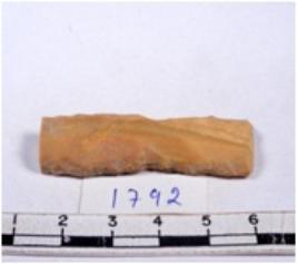 | Description / विवरण | A fragment of a rectangular shaped chert blade showing dorsal sides with sharp cutting edges having smooth surface and triangular section. |