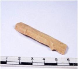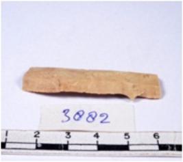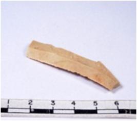 | Description / विवरण | A fragment of a rectangular shaped chert blade showing dorsal sides with sharp cutting edges having smooth surface and triangular section. |