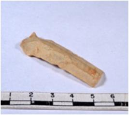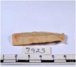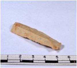 | Description / विवरण | A fragment of a rectangular shaped chert blade showing dorsal sides with sharp cutting edges having smooth surface and triangular section. |