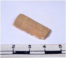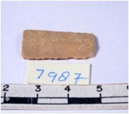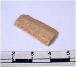 | Description / विवरण | A fragment of a rectangular shaped chert blade showing dorsal sides with sharp cutting edges having smooth surface and triangular section. |