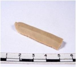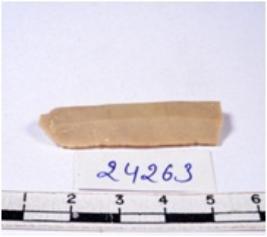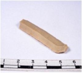 | Description / विवरण | A fragment of a rectangular shaped chert blade showing dorsal sides with sharp cutting edges having smooth surface and triangular section. |