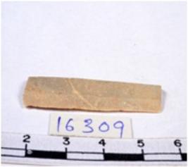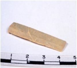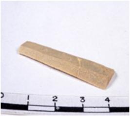 | Description / विवरण | A fragment of a rectangular shaped chert blade showing flat sides with sharp cutting edges having smooth surface and triangular section. |