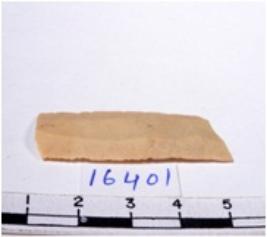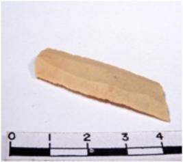 | Description / विवरण | A fragment of a rectangular shaped chert blade showing dorsal sides with sharp cutting edges having smooth surface and triangular section. |