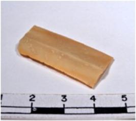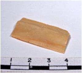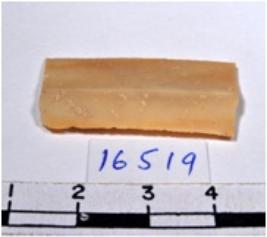 | Description / विवरण | A fragment of a rectangular shaped chert blade showing dorsal sides with sharp cutting edges having smooth surface and oval like section. |