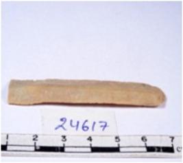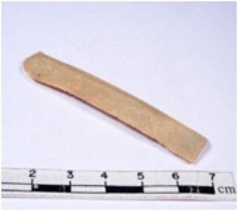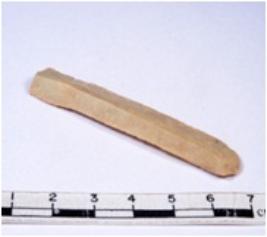 | Description / विवरण | A fragment of a rectangular shaped chert blade showing dorsal sides with sharp cutting edges having smooth surface and triangular section. |