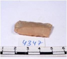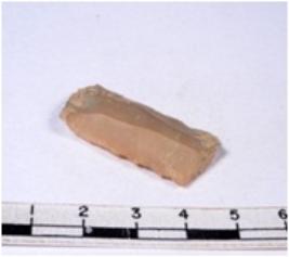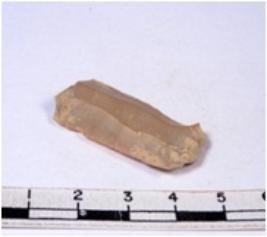| Description / विवरण | A fragment of a rectangular shaped chert blade showing dorsal sides with sharp cutting edges having smooth surface and triangular section. |