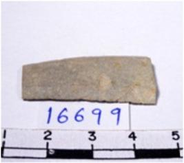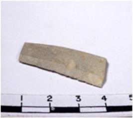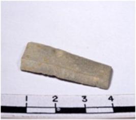 | Description / विवरण | A fragment of a conical shaped chert blade showing flat sides with sharp cutting edges having fine surface and oval like section. |