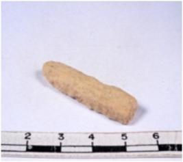 | Description / विवरण | A fragment of a rectangular shaped chert blade showing dorsal sides with sharp edges having smooth surface and triangular section. |