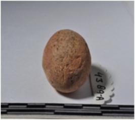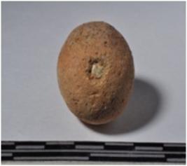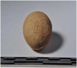 | Description / विवरण | A terracotta sling ball, round in shaped and rough surface. |