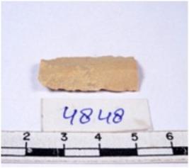 | Description / विवरण | A fragment of a rectangular shaped chert blade showing dorsal sides with sharp cutting edges having smooth surface and triangular section. |